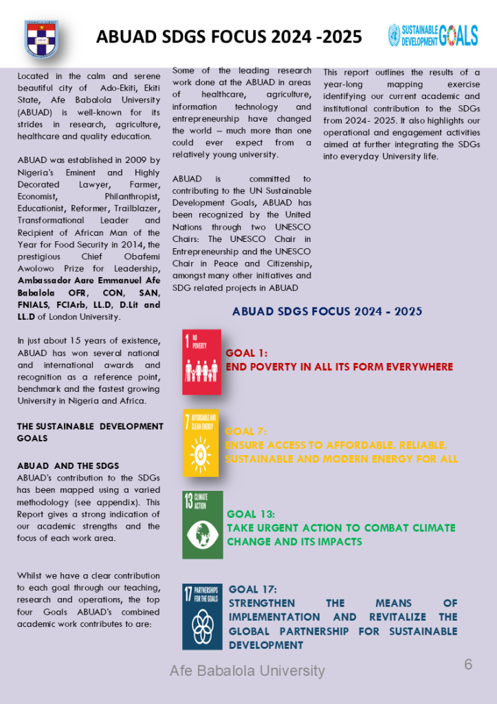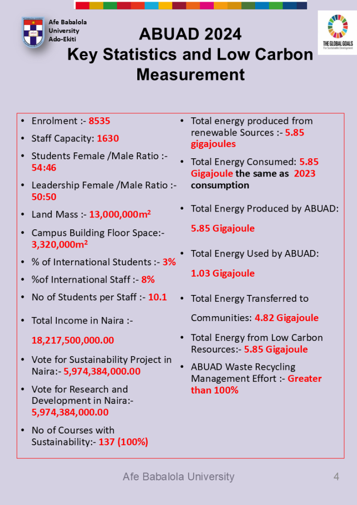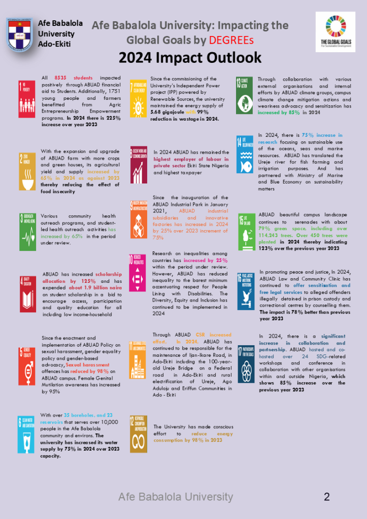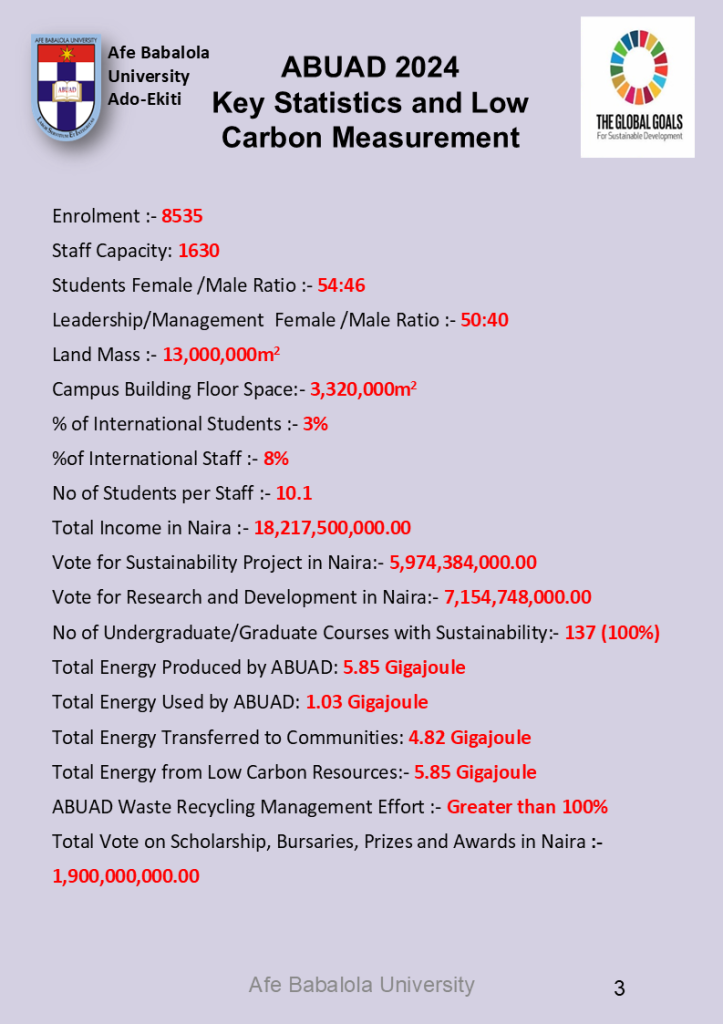 In 2024 Afe Babalola University (ABUAD) has continued to take steps to promote sustainability literacy among its students. The level of sustainability literacy is measured through the following ABUAD Sustainability Initiatives: