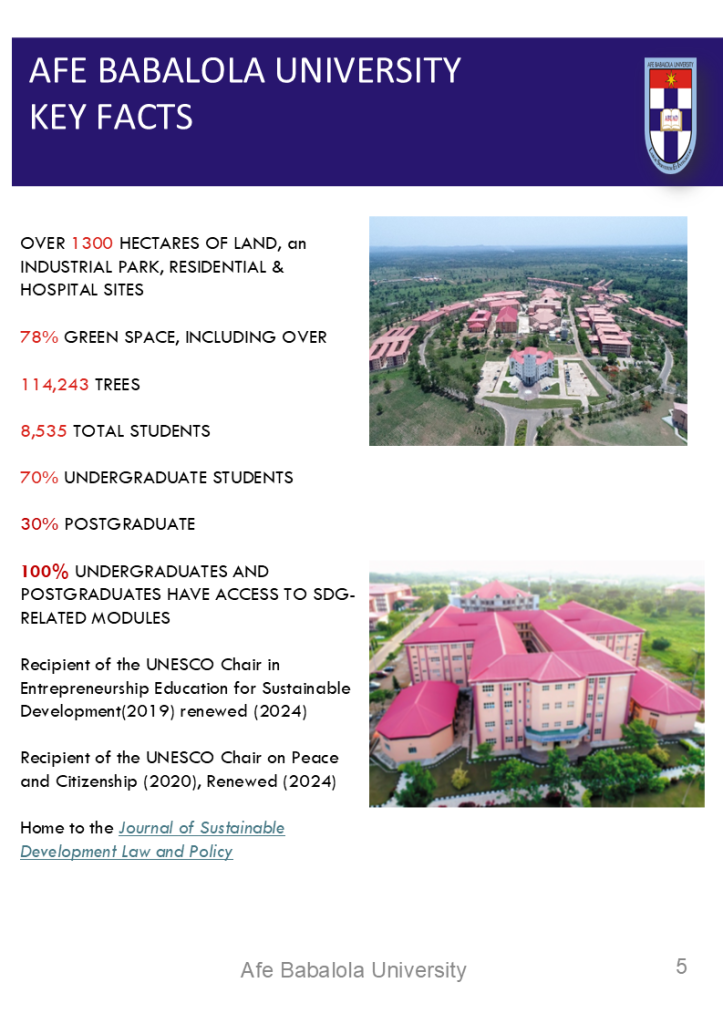 Some sustainability courses are named AFE Institutional Courses after the founder, Aare Afe Babalola. These courses are developed as part of the university curriculum and are required for graduation with a minimum of 1 credit each. This will be in addition to the minimum credits required for a student to graduate at both the undergraduate and postgraduate levels. The sustainability course assessments are based on exams, assignments, and projects to evaluate students’ understanding of sustainability concepts. Students/participants are sometimes encouraged to conduct research projects on sustainability-related topics, which can help assess their knowledge and critical thinking skills.