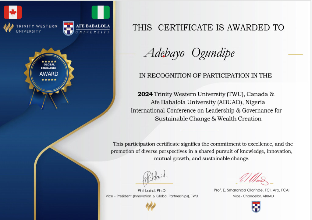 5. Non-University-wide Sustainability Education Assessments: ABUAD conducts surveys or questionnaires to assess students’/participants’ knowledge, attitudes, and behaviors related to sustainability. After the training, a certificate of participation is always issued to all registered participants. The sustainability course assessments are based on exams, assignments, and projects to evaluate students’ understanding of sustainability concepts. Students/participants are sometimes encouraged to conduct research projects on sustainability-related topics, which can help assess their knowledge and critical thinking skills. Case studies include the sustainability literacy measurement and impact assessment for the International Conference on Sustainable Leadership and Governance for Sustainable Change, Jobs, and Wealth Creation organized by Afe Babalola University, Nigeria, and Trinity Western University, Canada, on Thursday, October 19, 2024.