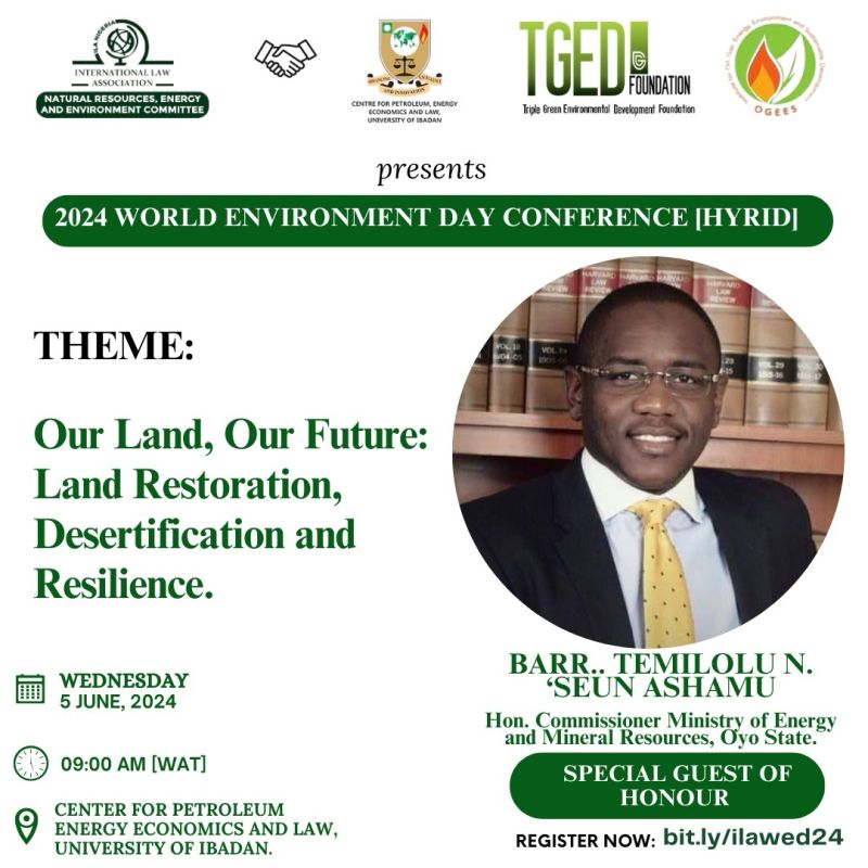 The Committee on Natural Resources, Energy & Environment (NREEL) of the International Law Association-Nigerian Branch under the leadership of Oluwaseyi Ebenezer, FESMI FSM FIMC CMC invites you to this year’s hashtag#WorldEnvironmentDay conference, featuring several eminent speakers. The event is organized in partnership with Institute for Oil, Gas, Energy, Environment and Sustainable Development, Afe Babalola University, Triple Green Environmental Development Foundation (TGED Foundation) and CPEEL University of Ibadan