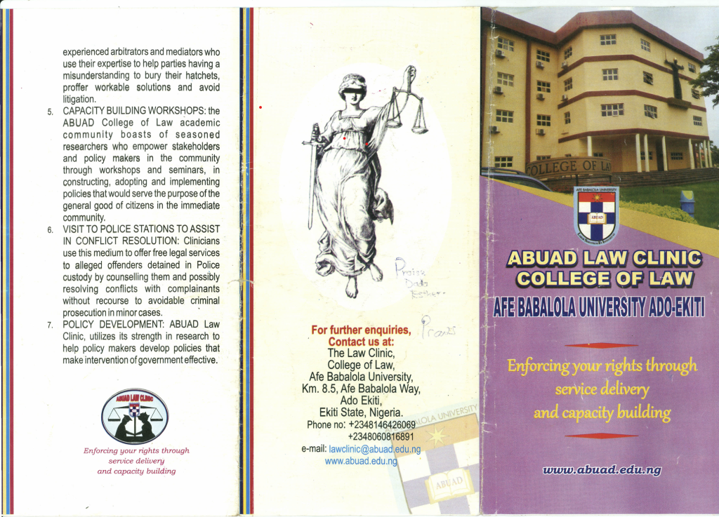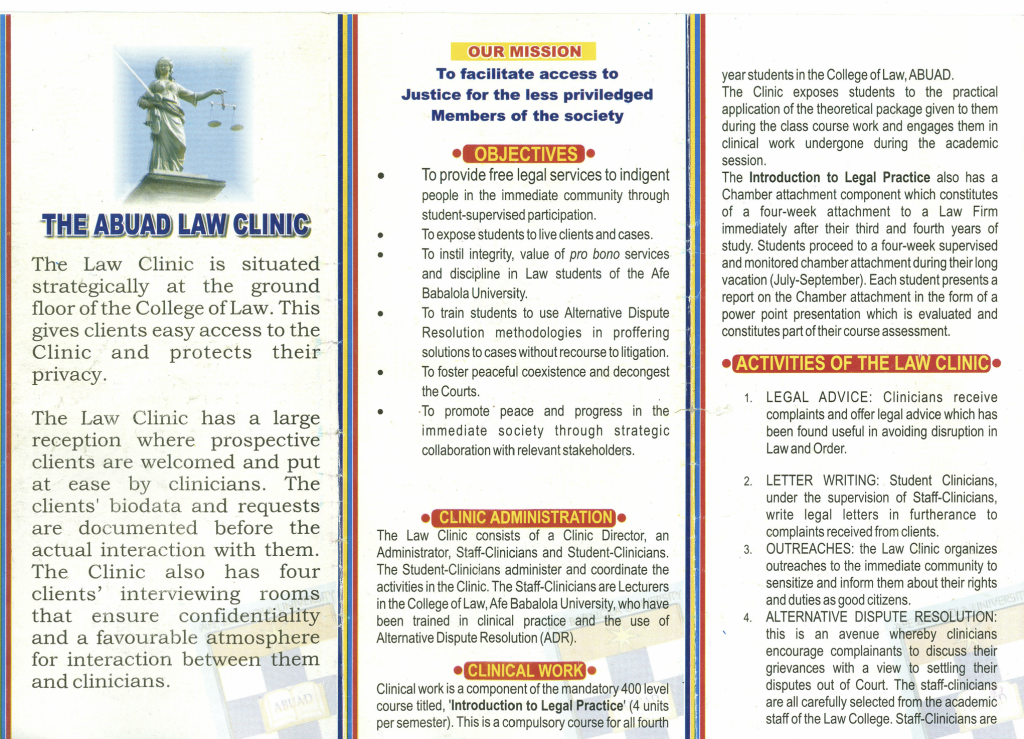 The Clinic is manned by a Clinic Director, an Administrator, Staff-Clinicians and Student Clinicians. The Administrator who is also a lecturer in the College of Law, administers and coordinates the activities in the clinic. The staff-clinicians are lecturers in the College of Law, ABUAD, who have been trained in clinical practice and the use of Alternative Dispute Resolution (ADR) to settle disputes. The student-clinicians are 400 Level students at the College of Law.