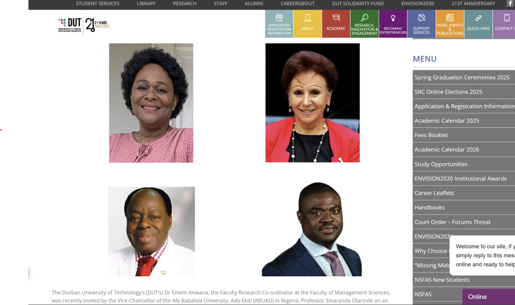 In 2024, ABUAD has continued its collaboration with the Durban University of Technology’s (DUT’s) Dr Emem Anwana, the Faculty Research Co-ordinator at the Faculty of Management Sciences, was recently invited by the Vice-Chancellor of the Afe Babalola University, Ado Ekiti (ABUAD) in Nigeria, Professor Smaranda Olarinde on an academic exchange from 11 January to 15 January 2024. The aim of the visit was for Dr Anwana to engage in various sustainability in academic programmes to strengthen areas of collaboration between DUT and ABUAD, Africa’s fastest growing university.